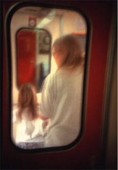 Las fotografías de Carlos son como las ventanillas de los trenes y si te asomas a ellas puedes ver el tiempo distorsionado de un mundo sin tonos intermedios en el que el rojo rabioso reclama toda nuestra atención. Un universo en el que la figura humana no importa por su psicología sino por su lugar exacto en el encuadre y por la estela que deja su movimiento.