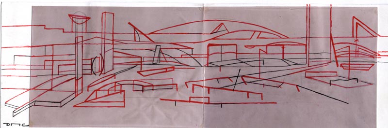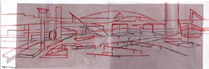 Así, una se sitúa en espacios que dibujan grandes ventanales donde a menudo el exterior y el interior se confunden, sea dentro de amplias estancias decoradas con formas delgadas de líneas que se comban, que se ondulan y adquieren movimiento y vida, o en lugares imaginarios pero de procedencia reconocible: imaginería que arrastran la ingeniería y la arquitectura civiles; amplias plazas, explanadas, largos paseos, extrañas piscinas de clubes privados, arquitecturas pobladas de elementos que a primera vista pueden parecer propios pero que observados detenidamente se van haciendo ajenos -y aquí el viaje de la observación realiza un giro contrario y da cuenta de la ambigüedad de los símbolos-, la raya que parecía árbol no es árbol sino lámpara, el banco no es tal sino cama, la cama no es cama sino sobre, la farola tiene antenas; hay líneas que se convierten en caballo, jinete, obstáculo, y porterías de rugby que podrían ser camillas y hablar de esos ciudadanos ausentes, recluidos... Elementos que, si me permiten la interpretación, hablarían de comunicación, a pesar de la ausencia de la figura humana o de lo aparentemente deshumanizado del paisaje; parecería que los dos bastones colocados en la pared entablaran un diálogo y fueran dos personas que hablan con la cabeza apoyada en un muro. Hay pretiles en los que el humo de coches invisibles dibuja el paso del tiempo, banderines y banderas cuyos motivos son transparentes, cables que comunican, que transmiten recuerdos que llegan a la memoria y que ésta reconoce como procedentes de la infancia con toda la distorsión que produce el tiempo.