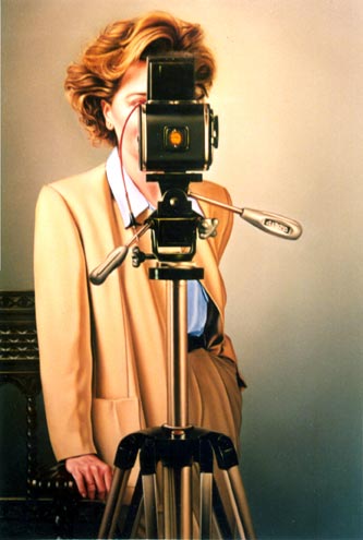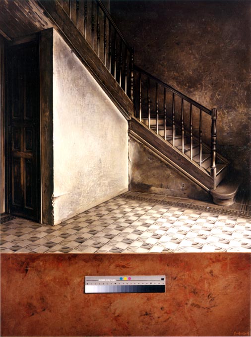 La obra de Landazabal constituye, así, una escalera de color de la Vida hacia el Arte de las fotos coloreadas a la Escala de grises de la desnaturalización en blanco y negro-, en correspondencia con la gradación de la escala natural de los seres vivos a las cosas y que, merced al manierismo de esa doble figuración -la de la naturaleza y la del objeto-, proyecta sobre la realidad del espectador esa misma dualidad abierta a la interpretación: o bien el artificio de su pintura nos hace sentirnos más reales en virtud de la fuerza del deseo-, o bien, si la representación naturalista engaña a los sentidos, más ficticios aún confirmando la construcción imaginaria de nuestro yo-, con la identidad del espectador en la línea de sombra entre la realidad y la ficción, con/fundiendo figura e invención, el genio y figura de un foto-grafómano cuya obra toma como modelo la Foto/Grafía y de ahí, nuestra realidad; porque no salimos en la foto y no se nos puede ver ni en Pintura-, pero sin llegar al desengaño Barroco en el pie de foto, a manera de subtítulo, una ironía conceptista: no la gracia unidireccional de la mirada jerárquica del Poder, ni el sarcasmo nihilista de un desesperado-, si bien con un escepticismo que apunta a la gama de grises, sugiriendo la reificación de los sujetos en nuestra sociedad de mercado el euro es rey-, la ilusión óptica óptima en su caso- de los sentidos en la grisura de la vida cotidiana.