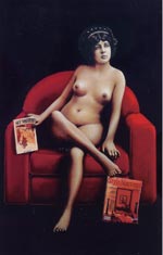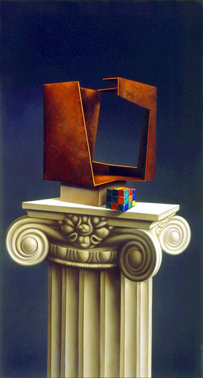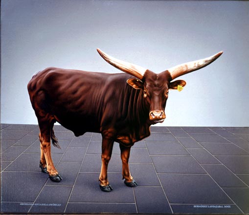 Las vacas vascas irrumpen como elefantes en una cristalería en las salas del arte vasco y posan de cara a la galería, estáticas, totémicas, al igual que otros motivos recurrentes como los crustáceos, en naturalezas, más que muertas, inmortalizadas la inmortalidad del cangrejo-, ramas y flores de cerezo amputado, disecadas, piedra tallada en escaleras y objetos industriales croissant, huevos de madera, agua-cates apócrifos-, ungidos por los profanos óleos de un taxidermista, envasados al vacío, encerrados en fotos, en salas, zaguanes, portales, que rehuyen el paisaje urbano- o la marina sin más agua que la ría encauzada de Bilbao o el agua-cate en un frasco-, bajo la luz del artificio, al igual que la amplia galería de personajes cerrando, con su anécdota narrativa a cuestas, el ciclo de los reinos de una Naturaleza desnaturalizada huevos tallados de un pájaro carpintero-, desarraigada hojas de cerezo mutilado, sujetas con tiritas, tiritando- y flotante fetos de agua-cate que echan raíces en un frasco en su evolución secuenciada como esqueletos en una Grafía apócrifa, fucsia, de morosidad cinética-, que apuntan, a través de guiños burlones al arte kitch y popagandístico de Andy Warhol la sublimación del color en la escala de la noche oscura del alma de la carátula de una Elizabeth Taylor a lo divino según San. Juan de la Cruz-, al mundo artístico de La columna dórica- decorativa y su escala de juegos de artificio desde el polícromo cubo de Rubick a la caja metafísica de Oteiza- en el estudio del pintor en la vitoriana calle del Cubo-.