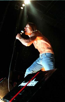 Iggy y los Stooges estuvieron arrasadores, nuevamente con buen sonido aunque en alguna ocasión el guitarrista sonaba un poco bajo. El sonido de los Stooges siempre se caracterizó por tener una base rítmica de bajo y batería muy machacona, sin arreglos y efectista y un guitarrista que realizaba solos incendiarios pero con el tono psicodélico de la época. El guitarrista se aleja de los solos del Heavy y lo suyo se parece mucho más al Clapton de Cream o al propio Hendrix pero eso sí con una fuerza e integridad que te dejan anonadado. La verdad es que muchas veces, durante el concierto no podías creer lo que estabas oyendo, con esas brutales guitarras tocadas ahora por un señor bastante gordito y con gafas clásicas que era nada más y nada menos que el fantástico Ron Asheton. Iggy sigue en forma, canta muy bien, su voz sigue siendo magnífica y sus movimientos salvajes permanecen inalterables desde hace más de 30 años. Iggy con el torso desnudo gritaba en castellano y en ingles y parecía poseído cuando gritaba a la audiencia Vascoooossssss, lo cual lograba alterar más a un publico que ya estaba alterado y entregado desde el principio. Por supuesto saltó entre el público se revolcó entre la masa y se echó cerveza por el cuerpo, subiéndose también a los bafles durante algunos momentos del show.