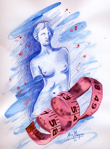 De mi cabellera pelicaída y estropajosa, la escasez de riboflavina desterró el brillo y el concierto... Pero estoy delgada. El calcio ausente de mi dieta va firmando en mis molares con su negra y fétida rúbrica... Pero estoy delgada. Sin nutrientes que la animen, mi tensión arterial zigzaguea a mis pies mientras procuro que el colocón hipoglucémico no despeine mi andar gatuno de top model hambrienta... Pero estoy delgada. La tiamina suprimida en mi castrada mesa mantiene lejos de mi almohada la sonrisa de Morfeo... Pero estoy delgada. En otro jardín distinto sembraron los colores que alguna vez otearon desde mis carrillos.... Pero estoy delgada.