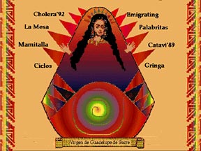 La boliviana Lucía Grossberger-Morales es una de esas creadoras que inciden en la tradición desde la tecnología. Su ubicación estadounidense facilita el encuentro y la revelación. Chólera 92 nació de la sorpresa y la fábula. I couldnt believe it, cuenta Lucía, I thought cholera had been eradicated (Grossberger-Morales, 1995: 7). 500 personas murieron de cólera en febrero de 1992 mientras Lucía visitaba Cochabamba. And of course it has been [eradicated] in first world countries (Grossberger-Morales, 1995: 7). Prosigue Lucía. Of course. Pero no en Cochabamba. Lucía computariza la tragedia en clave de humor negro, un formato que incomoda al puritanismo angloamericano: Quite honestly there are a whole group of installations that I want to do, but I cant because they arent sanitized enough for North American sensibilities. I have to admit sometimes I get really frustrated with how ethnocentric, isolated and intolerant North Americans are (Grossberger-Morales, 1995: 8). Lucía alteriza así al estadounidense, se instala en un centro computarizado que analiza con ojos tecnológicos su pasado, sus raíces, que critica. El trabajo Sangre Boliviana encapsula ese sentimiento de hibridez que hegemoniza desde la tecnología. Sangre Boliviana es una brillante propuesta multimediática que elabora en diversos formatos digitales y artísticos interactivos los sentimientos encontrados de centro y periferia, de pertenencia y exilio, de integración y des-integración. El índice de contenidos del CDRom presenta a una Virgen de Guadalupe de Sucre psicodélica cuyos rayos apuntan a las distintas secuencias desarrolladas, entre ellas el mencionado Cholera 92, una sección que se expresa bajo formato de juego electrónico. En otro de los trabajos incluidos, Caprivi89, palabra que alude al lugar de nacimiento de la autora en su visita de 1989, las imágenes aparecen acompañadas de los sentimientos que inspiran. A woman caught in two words, reza la última de ellas. Como la propia Lucía, la muchacha que aparece en esa imagen se desdibuja entre entidades en sepia y bajo relieve, entre ese Third World y el Primer Mundo al que apela su reflexión bilingüe. Lucía busca y provoca insertarse, rechaza el desvanecimiento, como en la ilustración titulada Fear of Fading. Meditación (inter)activa que se extiende a la mujer en el telar y la red, a la caja mágica que utiliza Lucía como motor y proyecto. Con su propuesta tecnopoética, Lucía Grossberger Morales, personalidad híbrida y múltiple, comenta y denuncia la exclusión. Se inserta en la máquina. Seculariza.