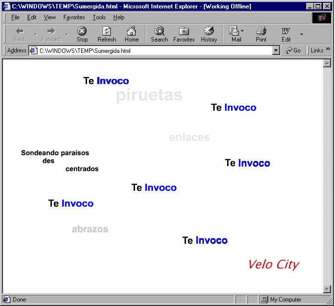 Por su parte, Alm@ Pérez, pseudónimo de Tina Escaja, española ubicada también en USA, invita al encuentro desde la propuesta hipertextual. Su tríptico VeloCity multiplica instancias y opciones, en una escalada de palabras que se suceden al ritmo interno de la lectura poética. Ciertas falacias digitales se cuestionan a su vez, y hago autocrítica. El lector-internauta al que apela la Pérez tiene opciones limitadas. La autora dicta, ejerce de arquitecta en un engranaje de enlaces y bits que contradicen la presunta fluidez, a-linealidad, des-control tanto del acto poético hipertextual como de la imbricación considerada femenina. Rompe expectativas. Y ese acto de control que se dice ejerce novedosamente el lector o lectora ante el hipertexto les libera del papel tradicional pasivo, les convierte en centro de elecciones y partícipes de la creación. Pero el/la poeta digital sigue dictando opciones de lectura. Invita y señala, con la confianza de no ser desconectado-a, de que quien la lea no pierda, que no se pierda. Esa angustia añadida de la pérdida del centro, del enlace primordial, rompe asimismo la falacia liberadora del acto de la lectura. Y al mismo tiempo, la desconexión posible expone la ansiedad de toda creación hipertextual, la ruptura del Enlace, ese lugar en mayúsculas de encuentro al que invoca Alm@ Pérez. Su trabajo VeloCity consiste precisamente en convocar, en accederse al cibernauta, celebrando al mismo tiempo el acto total de la comunicación electrónica, ciberfísica, ese encuentro entre el verbo y los nodos, entre la lengua y los sistemas operativos. La unidad final con el verbo reciclado, manoseado, clickeado, y sus internautas, constituye, en mi opinión, una de las claves principales de VeloCity.