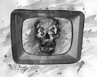 La pose funeraria del presentador tiene una sonrisa de más. Cuando el olor de la muerte dibuja una línea sensual, erecta en los gráficos del share se corre el riesgo de despejar involuntariamente la entrada a la mueca más inoportuna. Por muy profesional que se sea. Los telespectadores se beben los gestos estudiados del presentador, gestos que se pretenden compungidos, pero que no son más que tretas con forma de anzuelo catódico. La lenta agonía de una celebridad redunda en dividendos y los tiburones de las ondas no desaprovechan la ocasión de espesar aún más el fétido légamo en el que nadan y del que se nutren