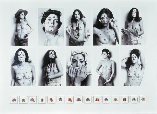 Hannah Wilke. Exchange Values" se organiza en cuatro grandes ejes temáticos que mantienen asismismo un cierto sentido cronológico. La muestra comienza con sus trabajos iniciales, dibujos y especialmente esculturas en cerámica, látex y chicle. Wilke fue la primera artista que, a finales de los 60, incorporó la iconografía vaginal a sus obras: vaginas creadas conmateriales diversos, de diferentes tamaños, en serie o aisladas, pegadas sobre el suelo, sobre la pared, en postales o fotografías, todas distintas y singulares.