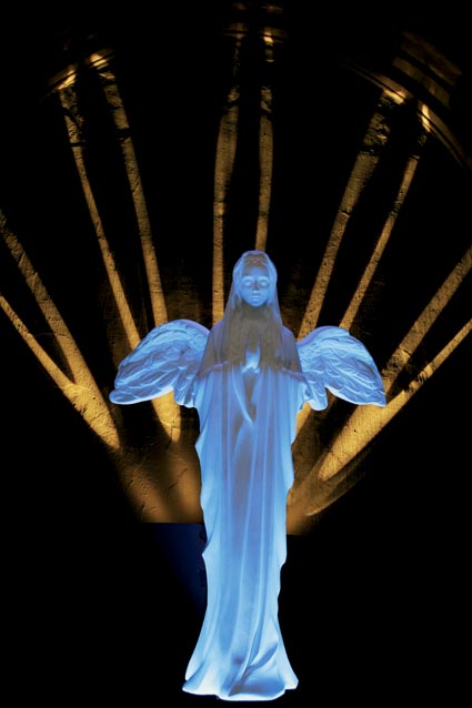 Desde los clásicos y después con el arte religioso medieval y gótico, la luz ha sido una herramienta para explicar la existencia, y por lo tanto la búsqueda de una realidad más completa. Pero también tiene gran importancia en la escultura contemporánea, desde Mario Mertz, Bruce Neuman, Dan Flavin, y en especial en el "milagro" del campo de relámpagos de Walter de Maria. Moholí-Nagy escribibía en 1926: "El espíritu inmanente busca luz, luz!". La "iluminación" es el estadio más alto del espíritu, es la toma de conciencia de uno mismo con su esencia y con todo lo que le rodea, es llegar al entendimiento, a la sabiduría. Las luces en este trabajo son la metáfora de ese logro, es lo que emana de un ser "iluminado", de un avatar, hoy, ese ser, es mi Virgen alada.