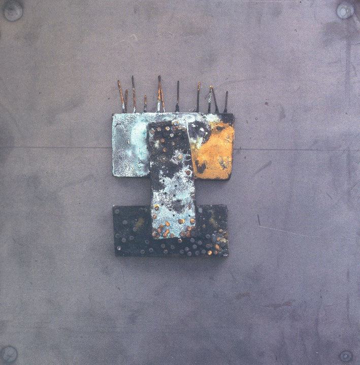 Y si antes escribíamos de lo temporal y lo trascendente en la obra de Velcha Vélchev a propósito del recurso a la escritura y en relación con la huella de lo orgánico, en su última exposición en La Misericordia el yugoslavo nos presenta una densa reflexión sobre el mismo tema en el ámbito de lo metálico, de lo industrial, que es tan significativamente humano como la escritura -o lo es más. Sus piezas de 50 x 50 y de 30 x 30 condensan en gestos casi esenciales lo que este autor tiene que decir al respecto. Los elementos fragmentados arrancan un auténtico torbellino de sensaciones que nuevamente nos remiten al paso del tiempo y sus consecuencias. Encontramos objetos de aspecto inequívocamente fabril reducidos a la categoría de fragmento; los claveteados hormiguean sin aparente sentido y nos remiten a una función perdida; la alternancia de diversas geometrías, de un ritmo asombroso desde el punto de vista plástico, sugiere igualmente remotos engranajes o ensambladuras cuyo diseño y finalidad desconocemos definitivamente. La abstracción de Vélchev se basa, así pues, en la fragmentación, en la liberación de los materiales empleados con respecto a sus ataduras referenciales, en la desfuncionalización (si se me permite esta expresión) de aquello que, suponemos, alguna vez cumplió una función práctica que ya ignoramos. El trabajo en pátinas remata la obra con una profunda e irracional inyección de nostalgia: un sentimiento que nos es tan primario como imprescindible. Estamos acostumbrados a que Vélchev mantenga de una u otra forma diálogos con el espectador. Aquí, las planchas metálicas sobre las que se disponen los objetos ejercen de matizados expositores, con los que el autor pretende transmitir de tú a tú toda esa sugerencia de la que hablábamos; y es verdaderamente difícil sugerir tanto con tanta concisión. Los grandes murales o puzzles de trapezoides de metal -hierro, estaño- nos vuelven a hablar de un ritmo que Vélchev nos regala con insultante destreza. Mediante la manipulación de la densidad y orientación de las arrugas en el estaño, el diverso grado de oxidación o corrosión del hierro o ciertas imponentes costuras, este pintor-escultor consigue enfrentarnos a un espejo roto que nos devuelve el reflejo de nuestra precariedad: el rugoso claroscuro de la materia y del tiempo que en definitiva nos componen. Y nos descomponen.