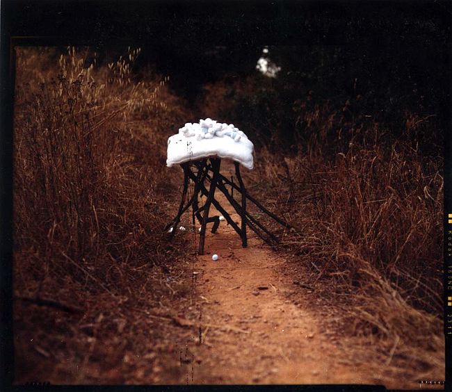 Por momentos la ventura halla otras estrategias de expresión que si bien no recurren al animal, hacen cómplice a la naturaleza. Quizás sus ambientes sean los mejores aliados para la marcada estetización así como para adentrarnos en lo desconocido. Lo sospechoso está en que el hombre juegue a interceder sobre lo natural y que se aferre a ver en el resultado la estrella de la esperanza. Casa de algodón acude a la construcción sobre el paisaje. Aluda el montaje irregular que se representa a una casa, una mesa, o una cama, cubierta de algodón, de igual manera hallamos un sueño inconcluso, que se pierde en el yerbazal y en lo profundo del camino. Las plantas medicinales florecen de nuevo potencia a tal grado el lirismo que, en su apretada síntesis, no caemos en cuenta desde el principio que de la planta sólo es propio el tallo, pues sus flores de algodón han sido dispuestas al gusto. ¿El traspié que la ironía le puso a la ilusión? ¿El temor de saber que por más que lo neguemos el destino marca sus propias expectativas? Con el deseo de no ser parcial, me pregunto si será esta la metáfora del renacimiento a partir de los actos humanos positivos. Quién quita que no, sólo que ambas lecturas, por distintas que sean, están llamadas a convivir.