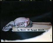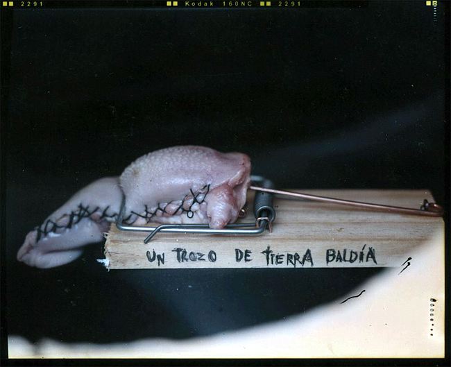 Un trozo de tierra baldía no cita el contenido del poema homónimo, es solo una oportuna coincidencia de palabras. Con ese título, más que enunciar lo perecedero de la sociedad, el autor parece forzar el silencio, es posible que sea el suyo propio. Una lengua de res aparece cosida por los hilos que ha tejido el hombre (nunca se supo cómo o cuándo se abrió) y es tan impropia su existencia que infaliblemente será sentenciada a la trampa de los roedores. Acecha la amenaza de la autorrepresión, una de las facetas más hirientes del sacrificio.