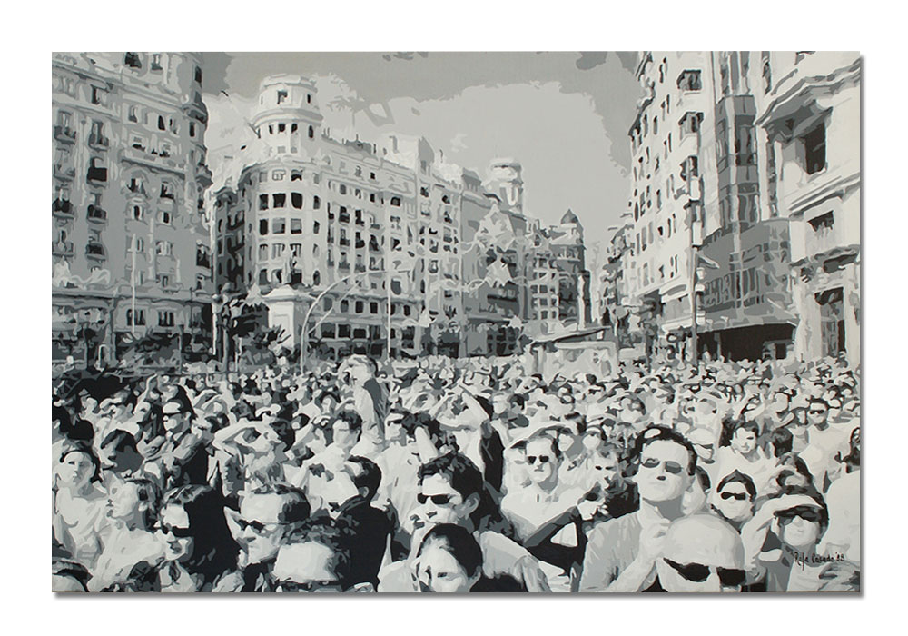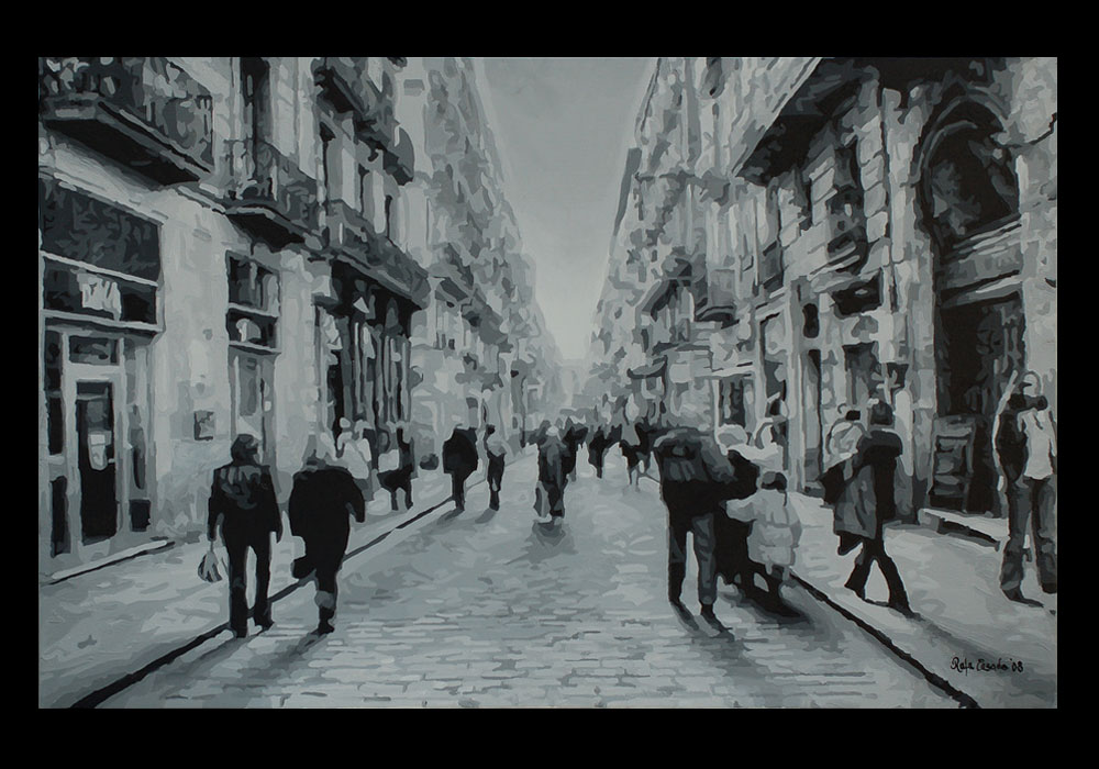 El enfoque de mi pintura es el de querer captar el momento preciso de un instante de la manera más real posible, tal y como lo hace la fotografía; supongo que por este motivo se me podría incluir dentro del “fotorrealismo” pictórico. El tema principal de mis cuadros son las escenas cotidianas urbanas, en las cuales siempre aparece la figura humana, que para mí tiene más interés que el propio escenario o el paisaje donde se mueve, un simple contexto o telón de fondo. Me gusta reflejar la ciudad, sus luces y sus ritmos, pero más la persona que la habita moviéndose en ella como personaje principal. No me interesa plasmar una calle si no hay una persona que la recorra haciéndola suya. Lo admito: Me encanta pintar multitudes, pero no como grupo en si, sino como reunión, muchas veces casual, de individuos que se cruzan en un mismo escenario. El uso del blanco y negro en mis cuadros realza el dramatismo de estos personajes que se mueven en solitario entre la multitud que los envuelve. Mi técnica es siempre el acrílico sobre tela o madera. Aquí podéis ver una muestra de mi trabajo. Espero que os guste.