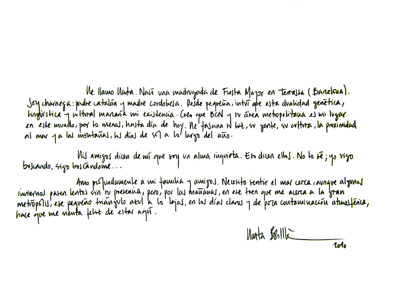 Me llamo Marta. Nací una madrugada de Fiesta Mayor en Terrassa (Barcelona). Soy charnega: de padre catalán y madre cordobesa. Desde pequeña, intuí que esta dualidad genética, lingüística y cultural marcaría mi existencia. Creo que bcn y su área metropolitana es mi lugar en este mundo, por lo menos, hasta día de hoy. Me fascina su luz, su gente, su cultura, la proximidad al mar y a las montañas, los días de sol a lo largo del año.