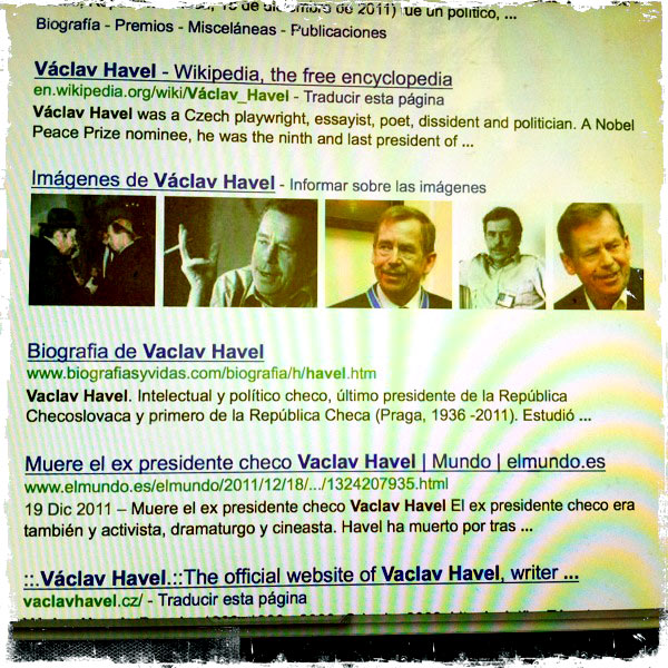 Con este post, no queremos hacer una necrológica al uso. La asociación cultural-literaria Luces de Bohemia que componemos no puede pasar por alto lo acontecido ayer. Y nos ha pillado con las manos en la masa: como lo leen. Habíamos quedado a hacer perníky y tortillas de patatas, y también acabábamos de perfilar el calendario de encuentros literarios para 2012 con la idea de abrir en febrero con el tema de la disidencia en la literatura: Havel iba a ser el objetivo de nuestras búsquedas literarias. Pero el fallecimiento de Václav Havel nos ha dejado K.O.