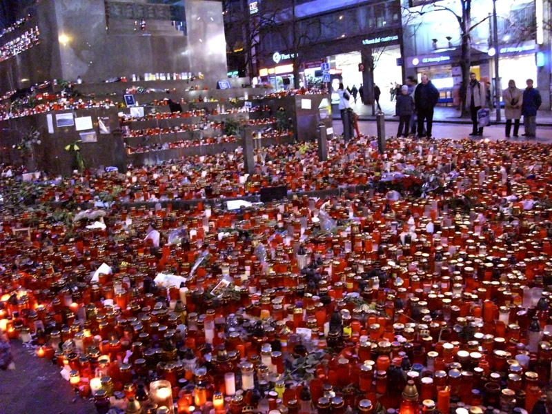 Aquel día desfilaron miles de personas por la iglesia, igual que mi amiga y yo. Probablemente todas escribieron la palabra “gracias‘’ en los libros. Muchas otras dejaron velas y flores en su memoria a los pies de la estatua ecuestre de San Wenceslao o en la Avenida Nacional. Al día siguiente otras miles acompañaron a pie el ataúd, en su camino desde la iglesia de Santa Ana hasta el Castillo de Praga. ¿Estaría la señora de la floristería entre ellas? ¿Habría encontrado una rosa blanca que regalar por fin a su presidente?