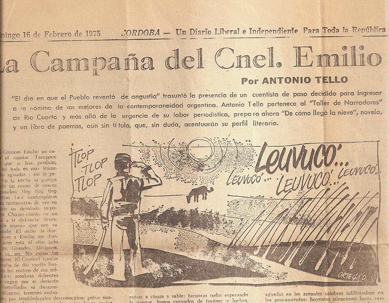 El coronel Emilio no conoce el rumbo, chajáa, el cielo es limpio, dulce y distante: sólo baja al fondo, en la lejanía vaciadora. Tlop tlop tlop, los pastos a la menor brisa susurran nuestro paso: sol sol soledad sol sol sol soledad sol. Es la hora de beber el duro sabor de los facones sin poder escupir la greda meticulosa: memoria polvorienta de pasadas humedades. Soy Emilio y no conozco el rumbo. El sol ya salió por algún lado y los colores de la madrugada huyeron, perdiéndose vencidos al final de la distancia. Los ángeles ya revolotean sobre nosotros. Tlop tlop tlop relin-in-cho: el caballo del coronel Emilio no se ha despertado y sueña: tlop tlop tlop resopli-pli-do. La sed. Sol sol soledad sol: olfateo el agua detrás de la lomada y Emilio no me lleva. Yo me galop-o hasta allá. ¡Eya diablo! El caballo de Emilio se ha desbocado y galop-a tras la lomada. Los otros apenas si levantan sus cogotes vencidos de sed: galop galop galop-e ¡shhhtooo! ¡Ta loco ta loco El Soñador! ¡shhtooo! ¡Quéviaestar loco si ahí hay agua! ¡shhhtooo! ¡Olfateo el durazniyo blanco! Galop galop galop-e: un indio bombero se escapa. El coronel Emilio le bolea el caballo. Rueda una bola de guadal entre las pajas bravas y en ellas se desvanece. Como Leuvucó. Como Leuvucó. Ayer se corrieron los médanos, hoy un indio se desvaneció, ya nadie cree en Leuvucó.