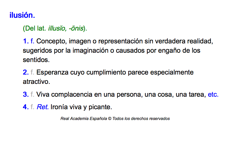 Pero la acepción principal es muy contundente, pues resuelve que la ilusión es el "concepto, imagen o representación sin verdadera realidad, sugeridos por la imaginación o causados por engaño de los sentidos".