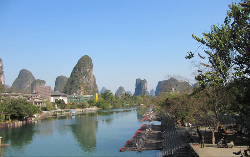 Sube Maite acalorada por la escalerilla de madera y me señala unas casas blancas y bajas rodeadas de cruceros: ¡Ya llegamos a Yangshuo! ¡Tenemos que bajar! Y, por supuesto, bajaremos. ¡A eso hemos venido, camarada!