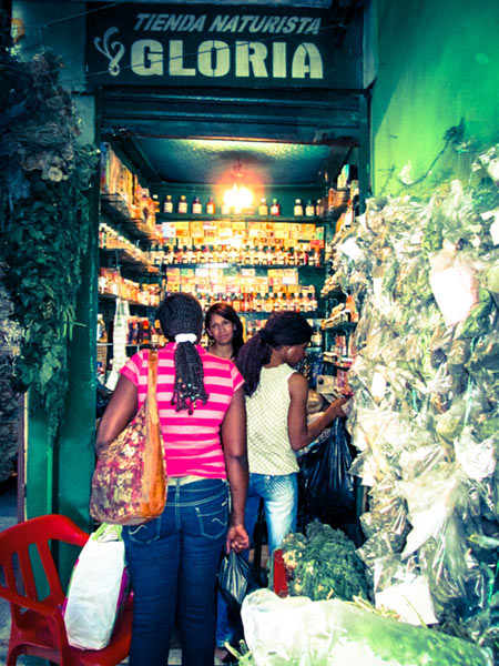 Viste como las muchachas de la ciudad, con camisetas vistosas y jeans ajustados. Peina su melena negra con una trenza que cuelga delante de su pecho. Yorlady Dianey trabaja en Naturalezas Gloria, una tienda diminuta encajonada en la esquina de un edificio bajo, una tienda naturista con mucho color dedicada a la venta de las plantas medicinales que curan los problemas del cuerpo y sirven para diferentes bebidas refrescantes y mezclas aromáticas. Su actitud dialogante y su simpatía le permite entablar cualquier conversación con las personas que se acercan a su lugar de trabajo, donde cuelgan sobres de plástico con hierbas y ramas tropicales en su interior, así como otras plantas que se muestran en medio de la acera. Plantas para la suerte, ramas para el té, hierbas para baños son las expresiones que salen de sus labios mientras atiende a las mujeres y hombres que se acercan por las calles del centro de la ciudad para comprar hierbas que mejoren su salud o su belleza hasta llegar a esta tienda encajonada entre dos locales de moda, más amplios y más modernos, pero asimismo, más vacíos… “Esta se hierve con aguapanela, ¿me entiende?”, le dice a una joven de color canela que se interesa por los beneficios de una rama que le quitará el dolor de cabeza. A los clientes les explica las propiedades de cada planta en cuestión. Ellos preguntan y ella, que lo sabe todo de las hojas que curan las dolencias del cuerpo y de las ramas que calman los sufrimientos de la mente, responde con precisión, con sabiduría, con naturalidad. En menos de un cuarto de hora, la joven despacha con maestría a una docena de personas que entran y salen del local. Cuando le pregunto si le molesta mi presencia me invita a sentarme en una de las dos sillas de color rojo colocadas en la entrada del local. Desde ahí, sin moverme, puedo escuchar el latido de la ciudad y conocer las preocupaciones de la gente. Puedo fotografiar la calle desde el interior de esta tienda que me llamó la atención en mis paseos sin rumbo por la ciudad.