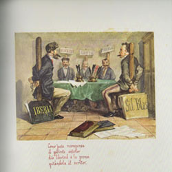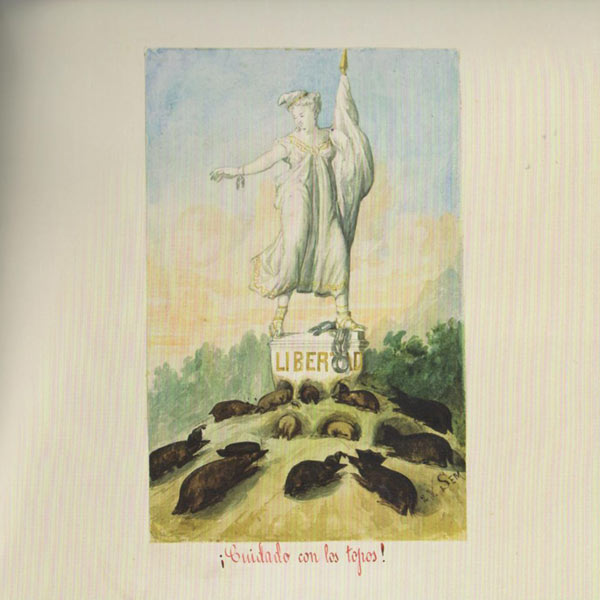 Los enemigos de la libertad —representada siempre con formas femeninas, incluso en la entrada del puerto de Nueva York, a veces mujer alada como en muchas plazas de Hispanoamérica— suelen atacarla de frente, cuando no intentan doblegarla con cañones o dictaduras. Aquí la socavan por lo bajo, horadan sus cimientos con galerías que la harán tambalear, tal vez caer, enemigos sutiles —clérigos y políticos, disfrazados de topos cegatones— que buscan desmoronarla. De nada le sirve haber roto las cadenas de la esclavitud y ofrecer un futuro de esperanza a quienes sepan vivir bajo su protección. Ya no mira hacia el frente, como solía hacerlo, sino hacia esos enemigos de siempre que intentan aniquilarla en 1868. No tiene miedo, sino simplemente se siente amenazada, pues no deja de enarbolar con su mano izquierda la antorcha que la simboliza.