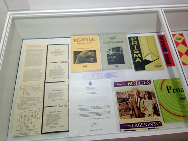 Hay más de trescientas piezas originales, las primeras ediciones de todos sus libros, objetos personales, traducciones, prólogos, firmas, fotos, carteles de cine, discos, conferencias, ilustraciones de su hermana Norah, artículos de prensa y revistas de época donde no solo hay primeras publicaciones de poemas y textos de Borges, también de autores españoles que en aquellas décadas publicaban en Argentina más que en España como Ramón Gómez de la Serna, Rafael Alberti, Gerardo Diego.