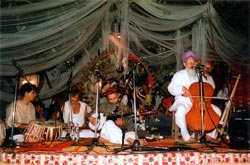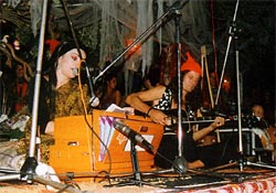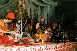 Me sitúe rápidamente frene al escenario y apareció una fantástica banda donde se mezclaban músicos hindúes, pakistaníes y el ingles que conocí en el mercado, los cuales hicieron un fantástico concierto de música india y tocaron junto con el sitar, el sarod, instrumento bastante complicado de oír en directo en occidente ; uno de los integrantes del grupo era un indio de setenta años que tocaba el violoncelo. Tras la actuación de este grupo se anunció una exhibición de bailes sufíes a cargo de un derviche. Se hizo sitio y empezó a girar como si estuviésemos en Konia la ciudad derviche de Turquía. Acabadas las actuaciones anteriores se anunció a NINA HAGEN. La cantante alemana, de la que poco se ha oido en los noventa, apareció vestida con un sari, un lunar en la frente y recitando plegarias a todas las deidades hinduistas.